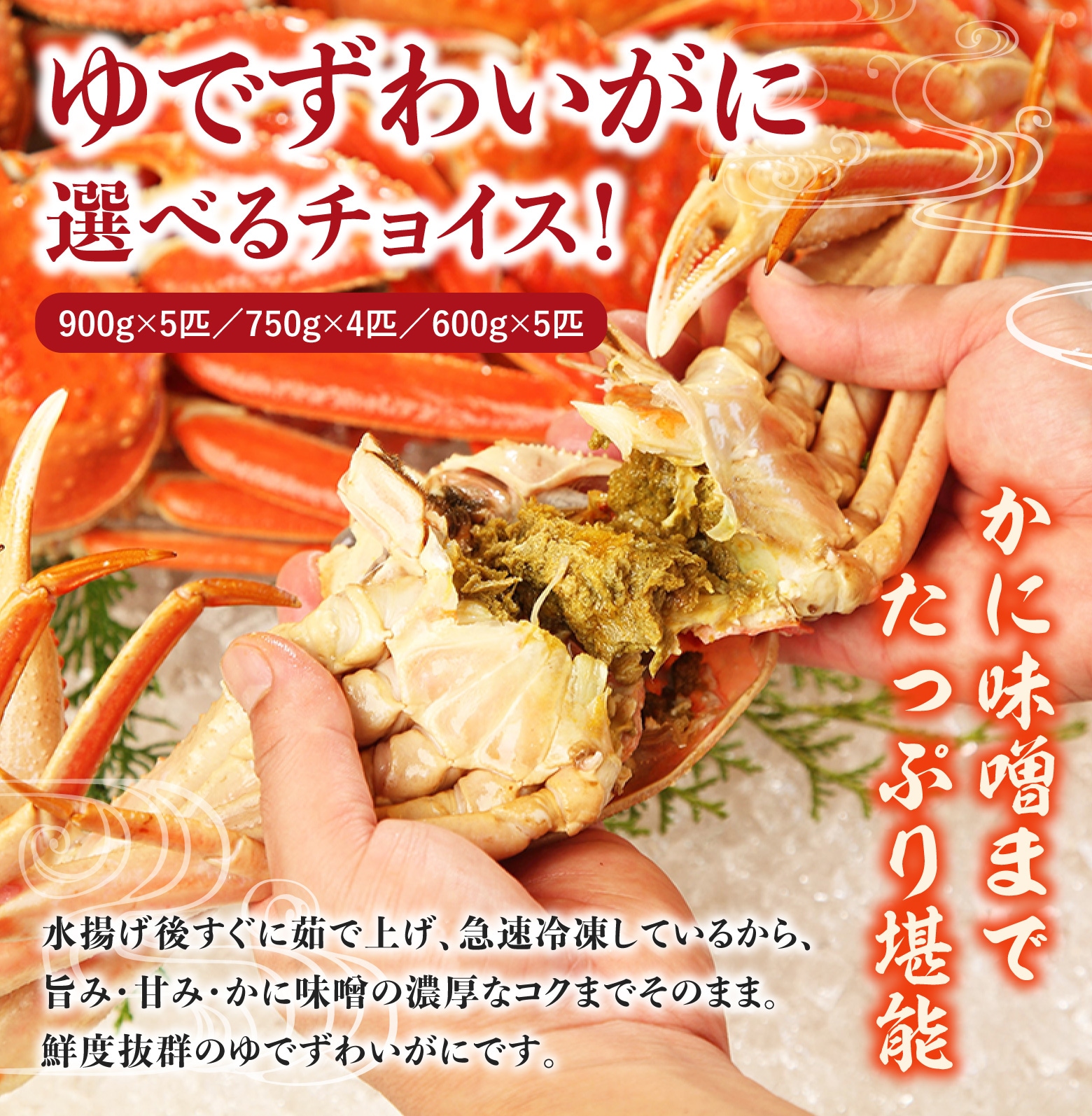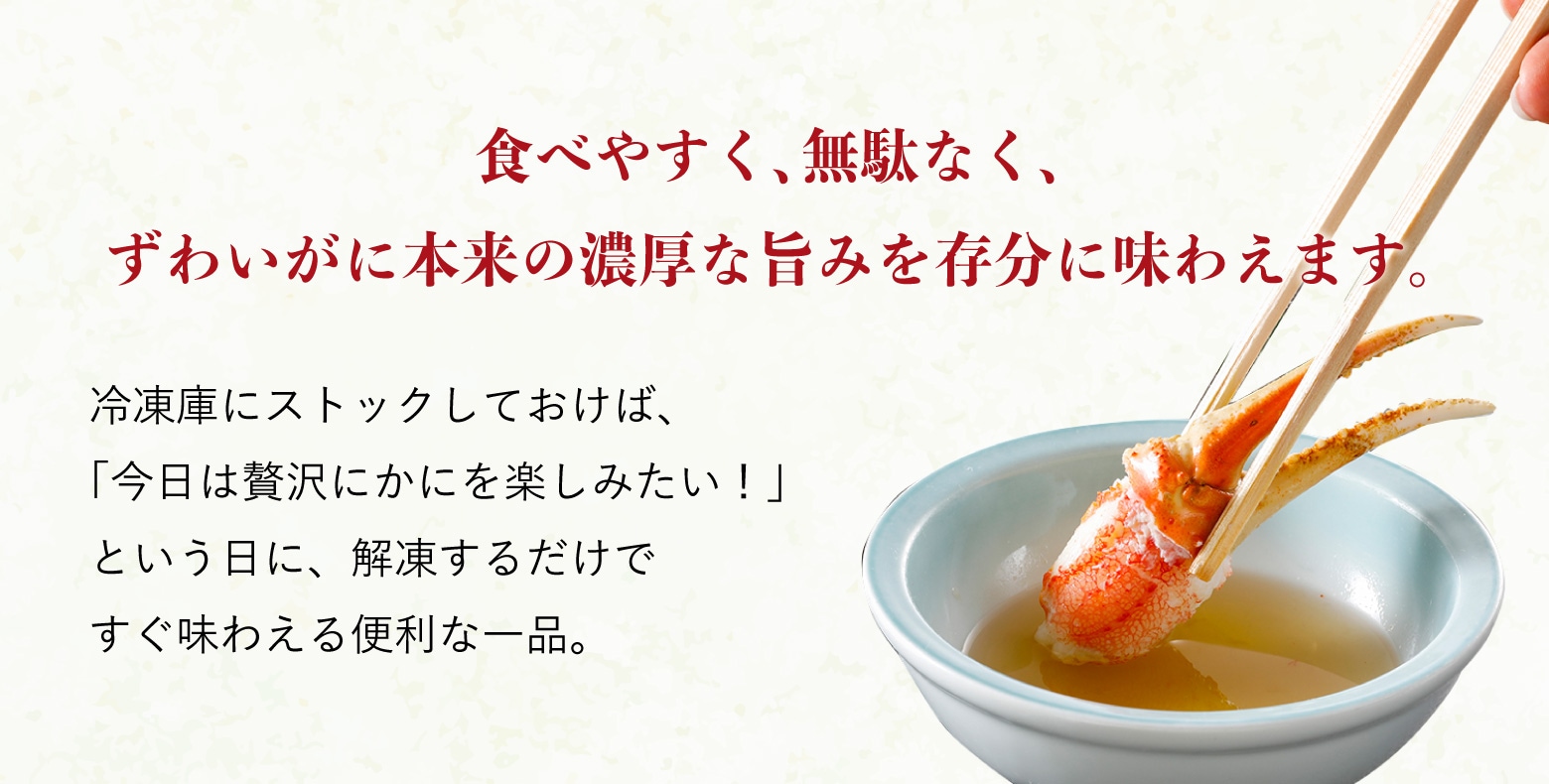かに専門バイヤーが鮮度・身入り・姿形などを厳選しておりますが、天然海産物のため個体差がございます。まれに身入りの少ない個体や、小指が欠けている個体が含まれる場合がございますが、自然の恵みとしてご理解賜りますようお願いいたします。