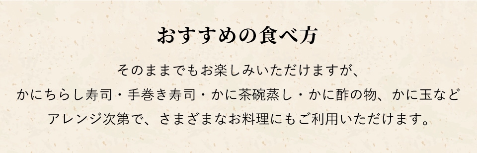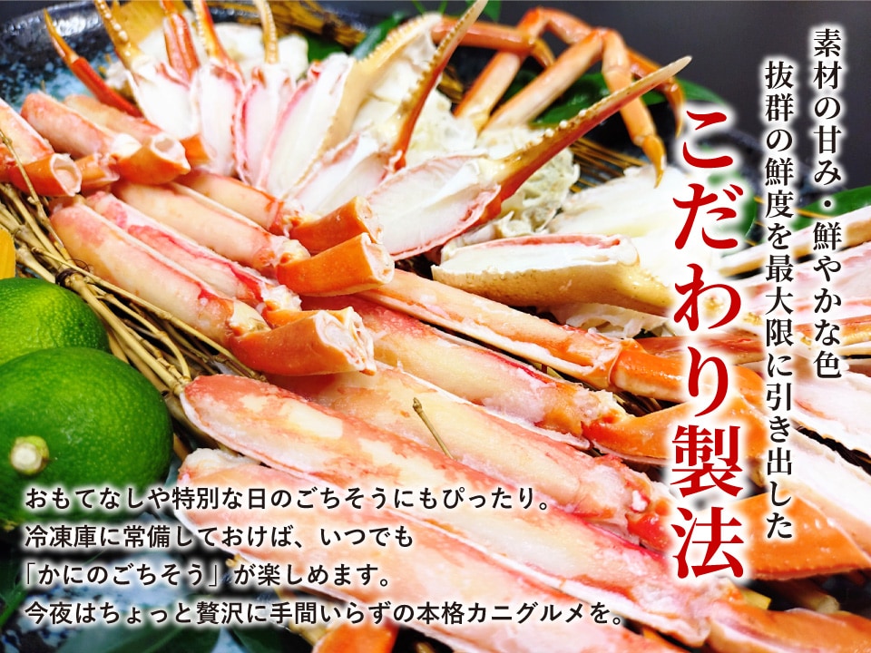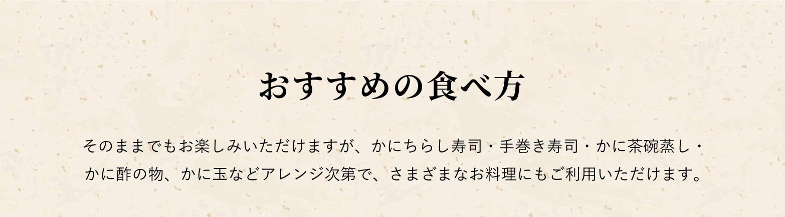 かに専門バイヤーが鮮度・身入り・姿形などを厳選しておりますが、天然海産物のため個体差がございます。まれに身入りの少ない個体や、小指が欠けている個体が含まれる場合がございますが、自然の恵みとしてご理解賜りますようお願いいたします。